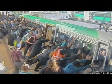 Mind the gap: Commuters push train to save trapped man in Perth