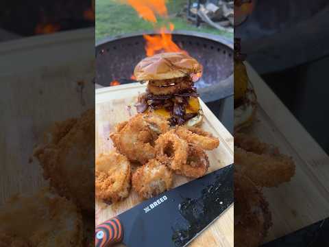 Onion Ring BBQ Bacon Burger 🧅🍔🔥 #cookingoverfire