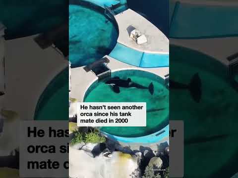 Kshamenk, a male orca at Mundo Marino in Argentina can barely swim through his tiny tank enclosures.