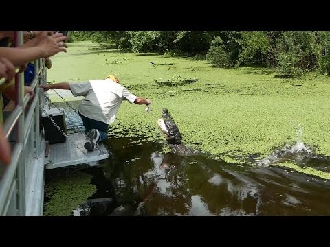 Tour guide feeds alligator with mouth