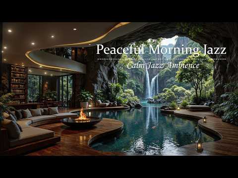 Relaxing Jazz in Forest Cave Living Room | Gentle Morning Jazz with Waterfall View for Work & Focus