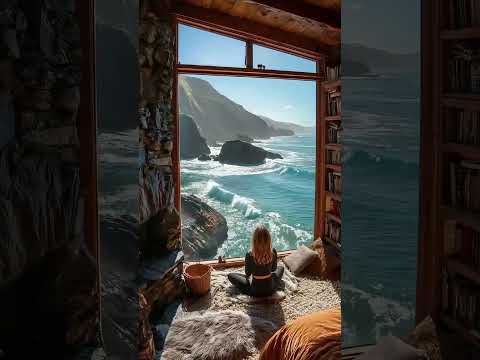 Seaside Cabin Zen: Yoga, Bookshelf, and Endless Ocean Beauty