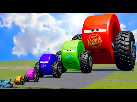 Big & Small, Long & Tall Colors Lightning Mcqueen with Monster Truck Wheels vs Trains | BeamNG.Drive
