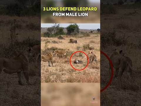 3 Lions Defend Leopard from Male Lion