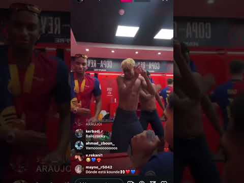 Barcelona players headed by lamine yamal dancing after defeating Real Madrid in Copa de lay final