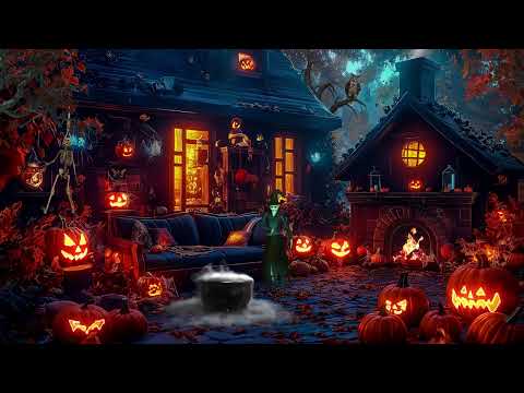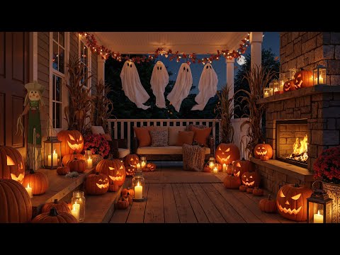 Cozy Haunted Halloween Patio Retreat - Fall Leaves-Jack O Lanterns-Spooky Ghosts-Crackling Fireplace