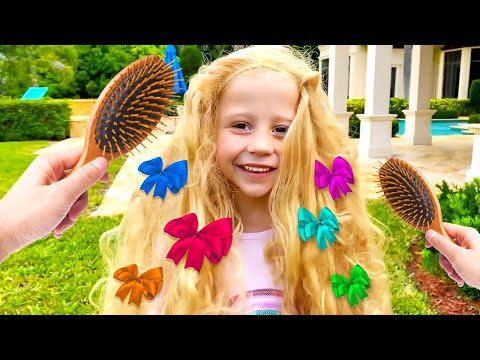 Nastya et Stacy jouent avec des jouets de coiffure et des cheveux de teinture