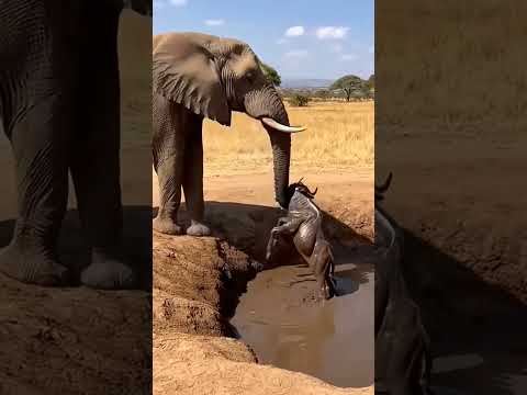 Giant Elephant Rescues Stuck Wildebeest Calf#wildlife #animalrescue #heartwarming